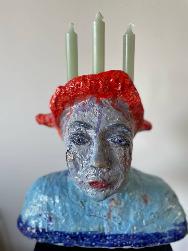 Zij is van grof chamotte klei gebakken en geglazuurd. Er kunnen 3 tot 5 kaarsen in haar hoofd.